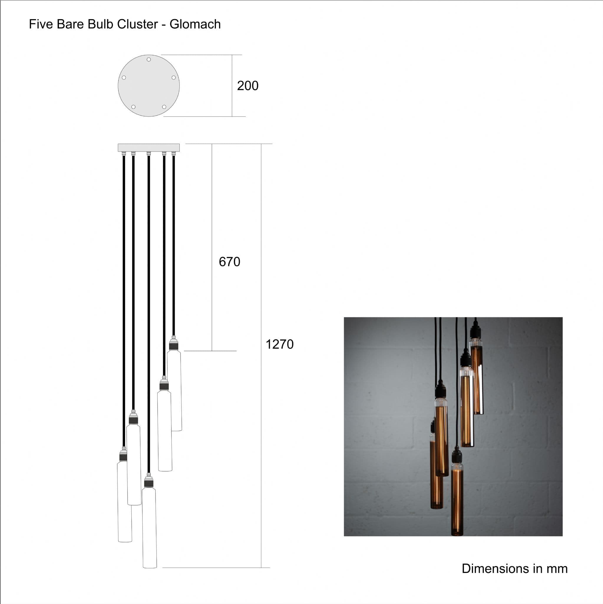 Home / Ceiling Pendant Lights / Ceiling Pendants View more images Product Description XL five bare bulb cluster pendant with 5 statement LED E27 Glomach Titanium bulbs The XL pendant comprises brass Fully Knurled sockets in Gun Metal, black fabric lighting cable and a 200mm Simple Black Ceiling Rose combined with brass cable guides in Gun Metal.Please do check the dimensions carefully, this a large pendant for a spacious room.Maximum drop 143cm. Minimum drop 79cmIf you would prefer a different length or colour of cable we can usually arrange this without any additional cost: please click here to enquire about a bespoke XL Five Bare Bulb Glomach Cluster ceiling pendantExclusive to The Vintage Light Bulb Company. Specifications MPN 660014 Drop Length 1430mm Ceiling Rose Diameter 200mm Cable Colour Black (three core) finish Black Ceiling Rose, Gun Metal Sockets and Cable Grips EAN 5056806305431 Bulb Type 5 x Dimmable E27 Glomach Includes Bulb? yes Voltage 240v Wattage 20Watts Brand The Vintage Light Bulb Company Product Code 660014 Customer reviews No reviews left yet Write A Review Most RecentTop Rated Description XL five bare bulb cluster pendant with 5 statement LED E27 Glomach Titanium bulbs The XL pendant comprises brass Fully Knurled sockets in Gun Metal, black fabric lighting cable and a 200mm Simple Black Ceiling Rose combined with brass cable guides in Gun Metal.Please do check the dimensions carefully, this a large pendant for a spacious room.Maximum drop 143cm. Minimum drop 79cmIf you would prefer a different length or colour of cable we can usually arrange this without any additional cost: please click here to enquire about a bespoke XL Five Bare Bulb Glomach Cluster ceiling pendantExclusive to The Vintage Light Bulb Company. Specifications MPN 660014 Drop Length 1430mm Ceiling Rose Diameter 200mm Cable Colour Black (three core) finish Black Ceiling Rose, Gun Metal Sockets and Cable Grips EAN 5056806305431 Bulb Type 5 x Dimmable E27 Glomach Includes Bulb? yes Voltage 240v Wattage 20Watts Brand The Vintage Light Bulb Company Product Code 660014 Reviews No reviews left yet Write A Review Most RecentTop Rated Dispatch & DeliveryDispatch and Delivery We dispatch orders Mon - Fri only £3.50 Standard TRACKED Delivery 2-5 Days £4.95 First Class TRACKED Delivery 1-3 Days £10 Guaranteed Next Day Deliveries for orders received before 2.00 p.m on Monday - Thursday £15 Saturday Delivery: Guaranteed Next Day Delivery for orders received before 2.00pm on Friday International Shipping starting from £5 to Europe and £10 outside Europe. All our prices are exclusive of any local taxes and import duties and you will be responsible for the payment of these taxes and duties. We use Royal Mail for smaller orders and Parcel Force for bulkier parcels ReturnsReturns We do offer a 30 day return policy for unwanted goods that are returned unused, packed as received with all of the original inner and outer packaging. Please read our full returns and refunds policy for further information. Faulty and Damaged items Our bulbs are fragile and despite our best efforts at careful packing and handling might occasionally arrive damaged. If you receive an item that is damaged then please contact us within 14 days of receipt at vintagebulbsuk@gmail.com Helpful InformationIf you would prefer a different length or colour of cable we can usually arrange this without any additional cost: please click here to enquire about a bespoke Five Bare Bulb Cluster - Glomach Titanium Delivery & Returns Dispatch and DeliveryWe dispatch orders Mon - Fri only£3.50 Standard TRACKED Delivery 2-5 Days£4.95 First Class TRACKED Delivery 1-3 Days£10 Guaranteed Next Day Deliveries for orders received before 2.00 p.m on Monday - Thursday£15 Saturday Delivery: Guaranteed Next Day Delivery for orders received before 2.00pm on FridayInternational Shipping starting from £5 to Europe and £10 outside Europe. All our prices are exclusive of any local taxes and import duties and you will be responsible for the payment of these taxes and duties.We use Royal Mail for smaller orders and Parcel Force for bulkier parcels Returns We do offer a 30 day return policy for unwanted goods that are returned unused, packed as received with all of the original inner and outer packaging.Please read our full returns and refunds policy for further information.Faulty and Damaged itemsOur bulbs are fragile and despite our best efforts at careful packing and handling might occasionally arrive damaged. If you receive an item that is damaged then please contact us within 14 days of receipt at vintagebulbsuk@gmail.com Customer Reviews XL Five Bare Bulb Glomach Cluster ceiling pendant Product Code 660014 20w - Dimmable £295.00 Login to add this product to your wishlist. You Will Earn 295 points which is the equivalent of £14.75 You May Also Like Small Santiago Pendant in Antique Nickel 0 review(s) More details Quickview Glomach Titanium LED E27 Tube 1 review(s) 4W Titanium Glass - Dimmable Add to cart Quickview XL Five Bare Bulb Gobi Large - Sand - Cluster Ceiling Pendant 0 review(s) 20w - Dimmable Add to cart Quickview Ranworth - rattan ceiling pendant 45cm Diameter 0 review(s) Optional half price bulb More details Quickview Out of stock Lamp Shade Bohol Antique Brass 0 review(s) Out of stock